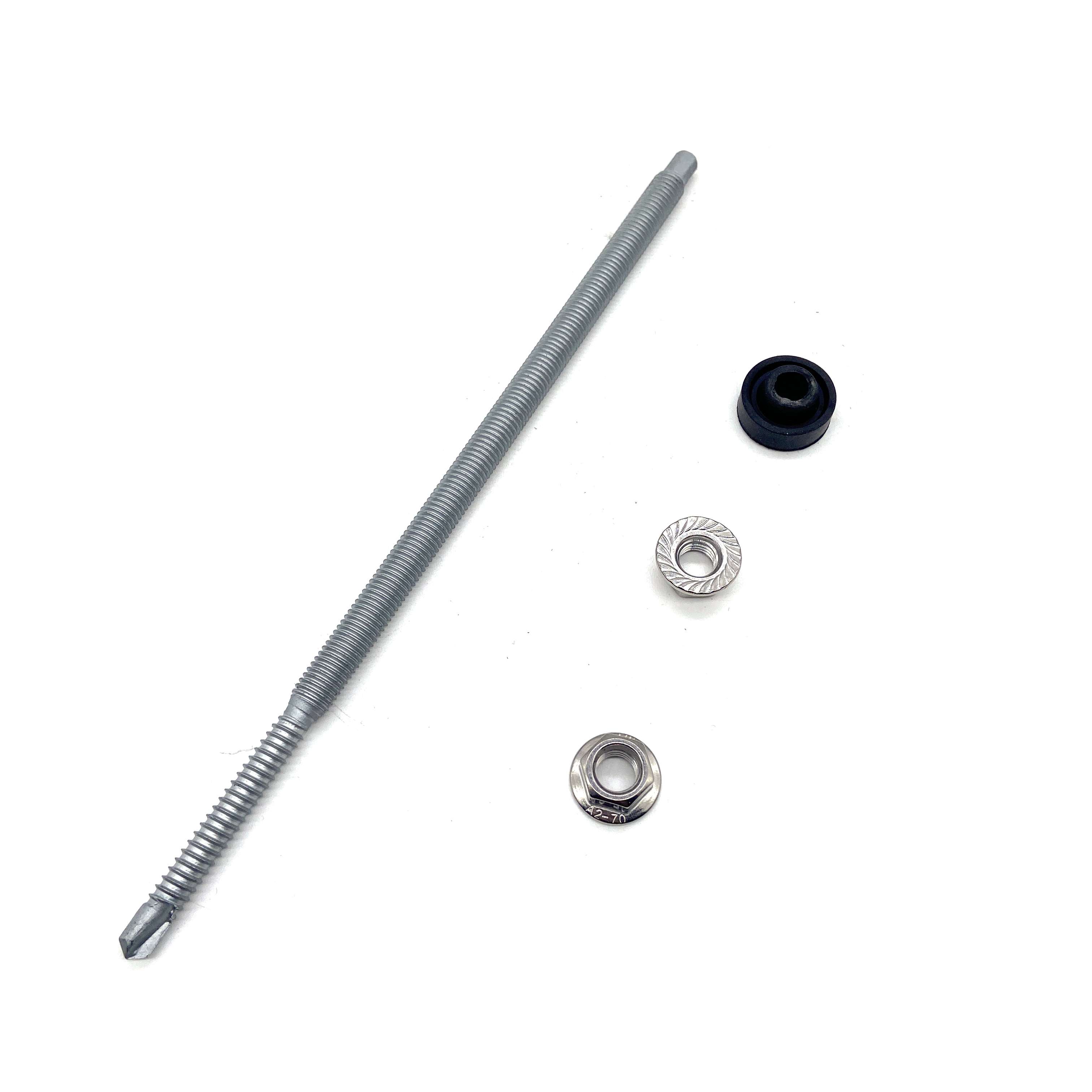 El perno de suspensión es un accesorio del sistema de montaje de techo solar de uso común, está hecho de acero inoxidable, adecuado para instalación en techos de metal corrugado, tejas de acero de color trapezoidal, tejas de asbesto, etc. Los montantes están hechos de acero inoxidable 304 con tuercas con brida M10 y Almohadillas de EPDM, lo que las hace adecuadas para el montaje en vigas de madera y acero.Ambos tipos de pies en L o placas ajustables se pueden utilizar juntos.